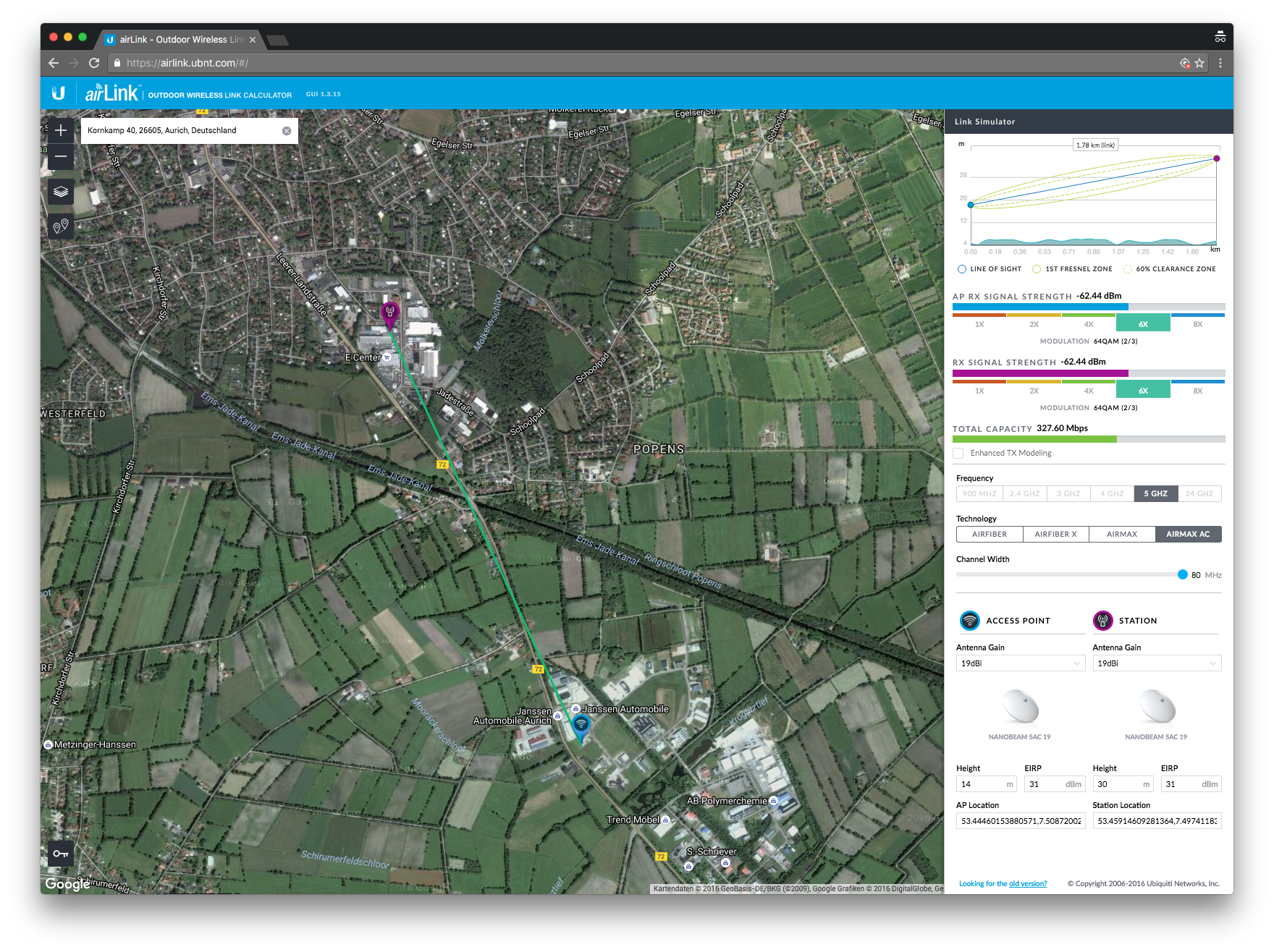 Ubiquiti hat mit dem airLink ein sehr hilfreiches Tool entwickelt, welches bereits bei der Konzeption die Performance einer Richtfunkstrecke einschätzen kann. Mit Hilfe der airLink-Karte können die zu verbindenden Standorte gekennzeichnet und im Nachgang die Höhen der jew. Komponenten definiert werden.
