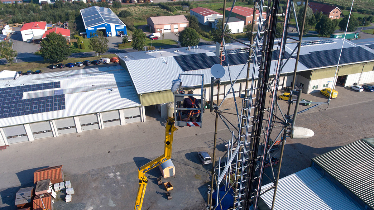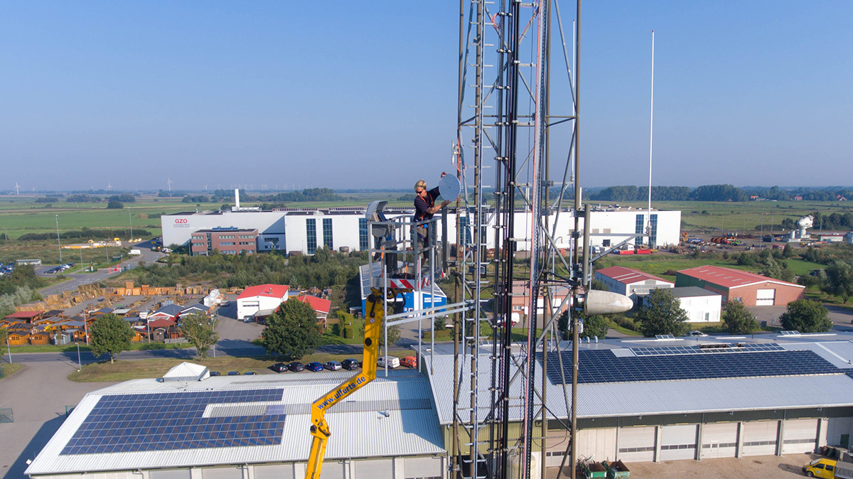 Als spezialisierter Dienstleister für komplexe Richtfunk-Projekte wurde die OMG.de beauftragt, eine redundante Standortvernetzung behördlicher Gebäude vorzunehmen. Die hier gezeigt Installation ist einer von vielen Schritten, die für dieses Projekt durchgeführt werden müssen.
