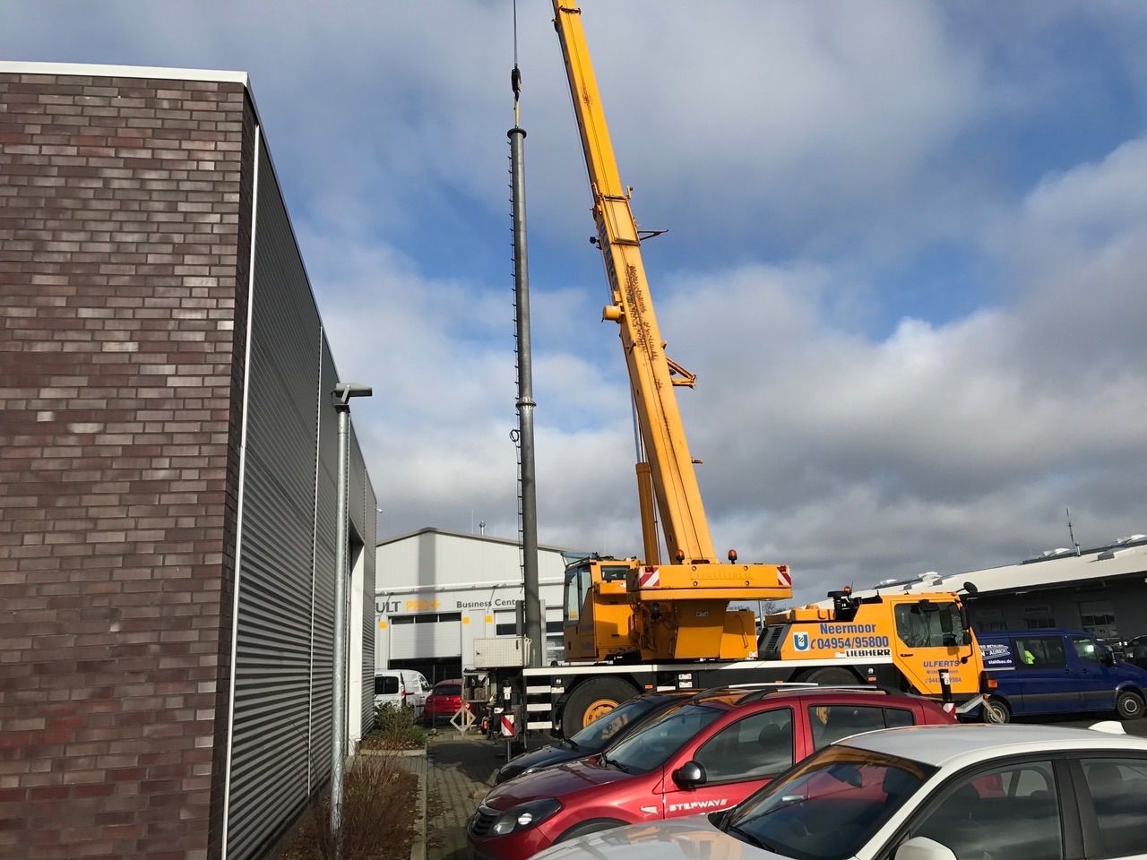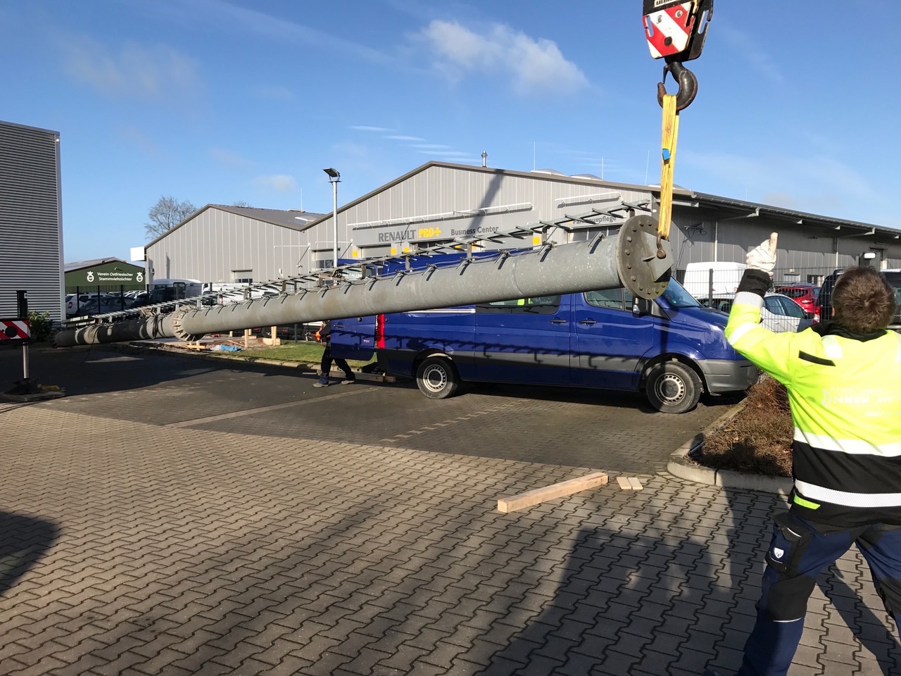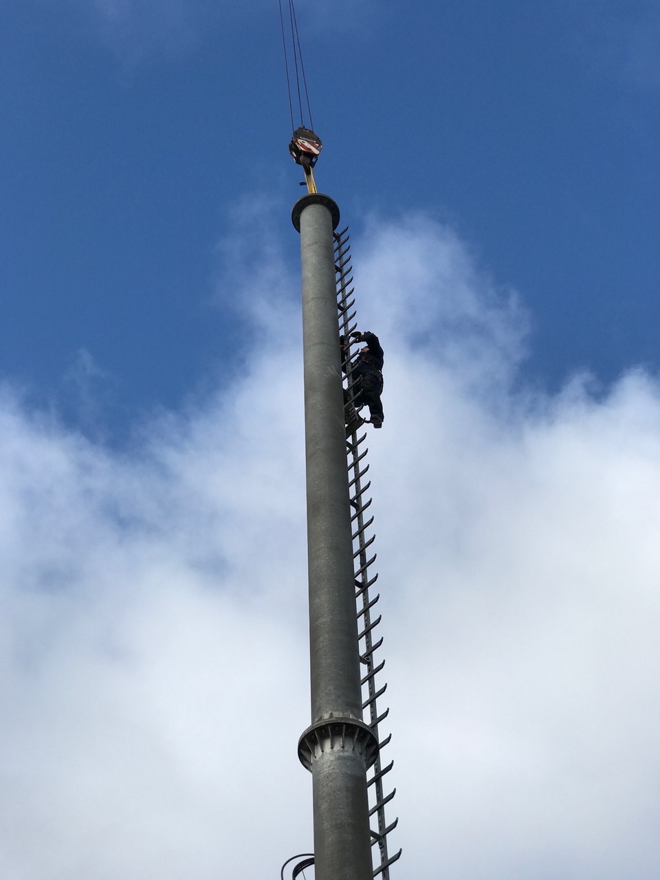 Die Anlieferung des Masts erfolgte in zwei Teilen. Innerhalb von wenigen Stunden wurde der Mast fertig zusammengebaut und aufgestellt.