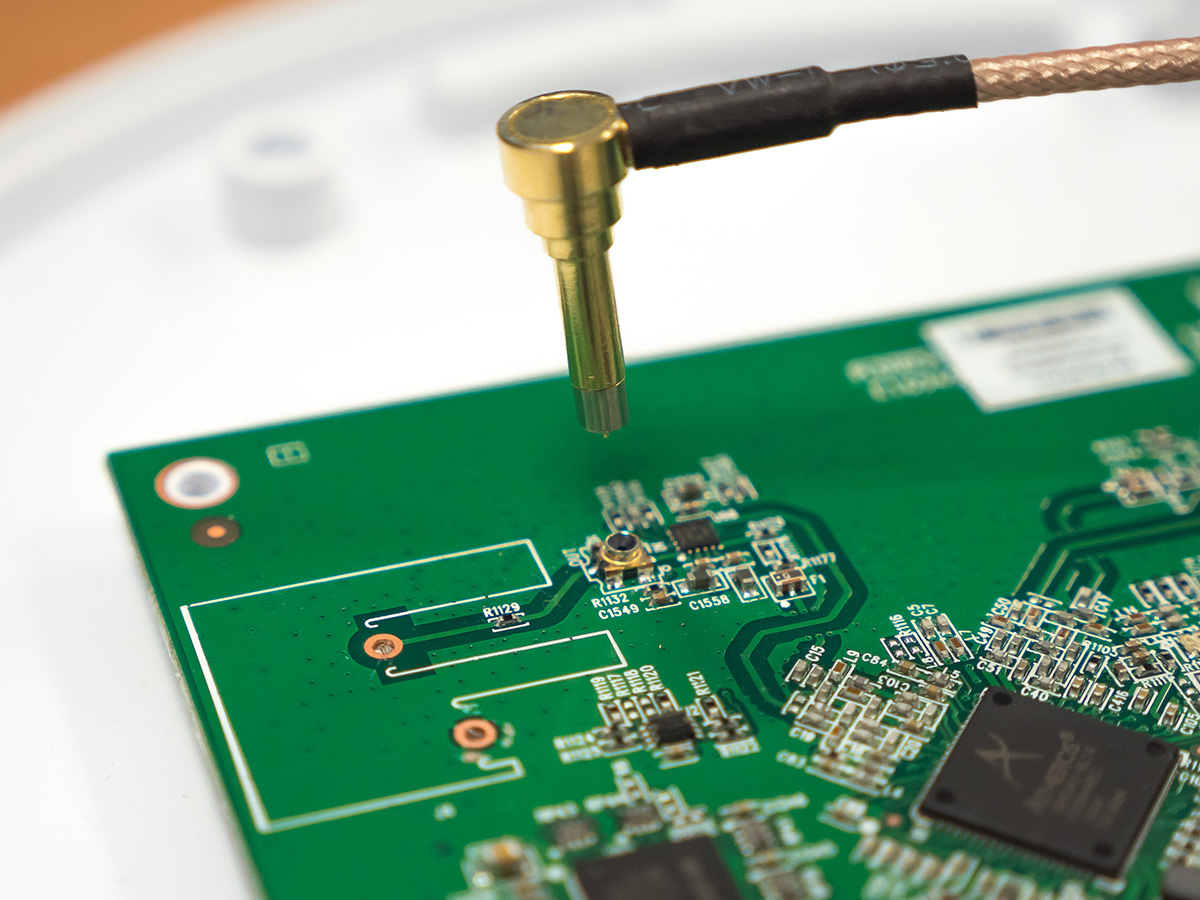 Auf den Testpunkt wird ein spezielles Pigtail (MS156 male – RPSMA female) aufgebracht, um das Signal abzugreifen.