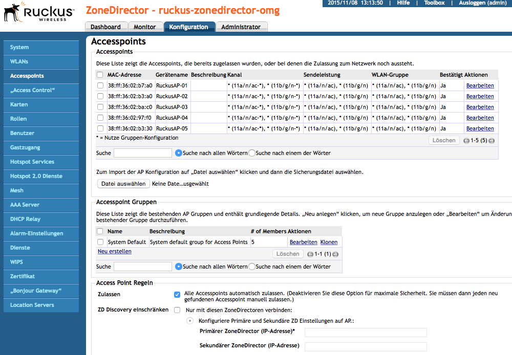 Sobald die Geräte angeschlossen wurden, werden diese automatisch in der Oberfläche des Zone-Directors als Ruckus Wireless APs erkannt und bei der standardisierten Grundeinstellung in das „Default“ WLAN integriert. Damit später eine eindeutige Zuordnung zu dem jeweiligen Installationsort möglich ist, macht es Sinn die Geräte sukzessive anzuschließen und in den Einstellungen mit dem jeweiligen Ort zu kennzeichnen.