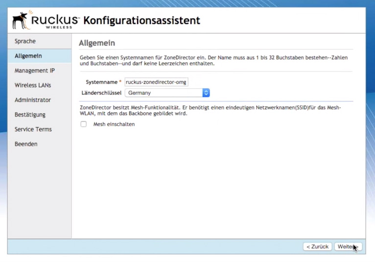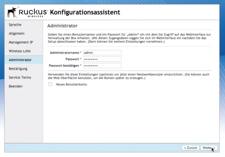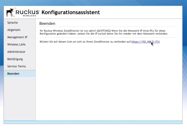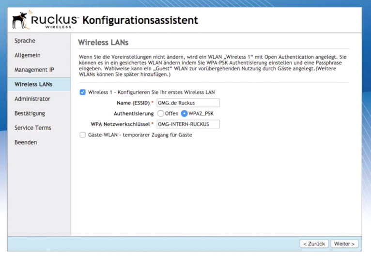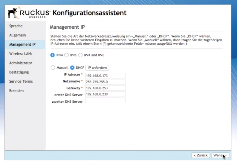 Sprache -> Allgemeines -> Management IP -> Wireless LANs -> Administrator -> Bestätigung -> Nutzungsbedingungen