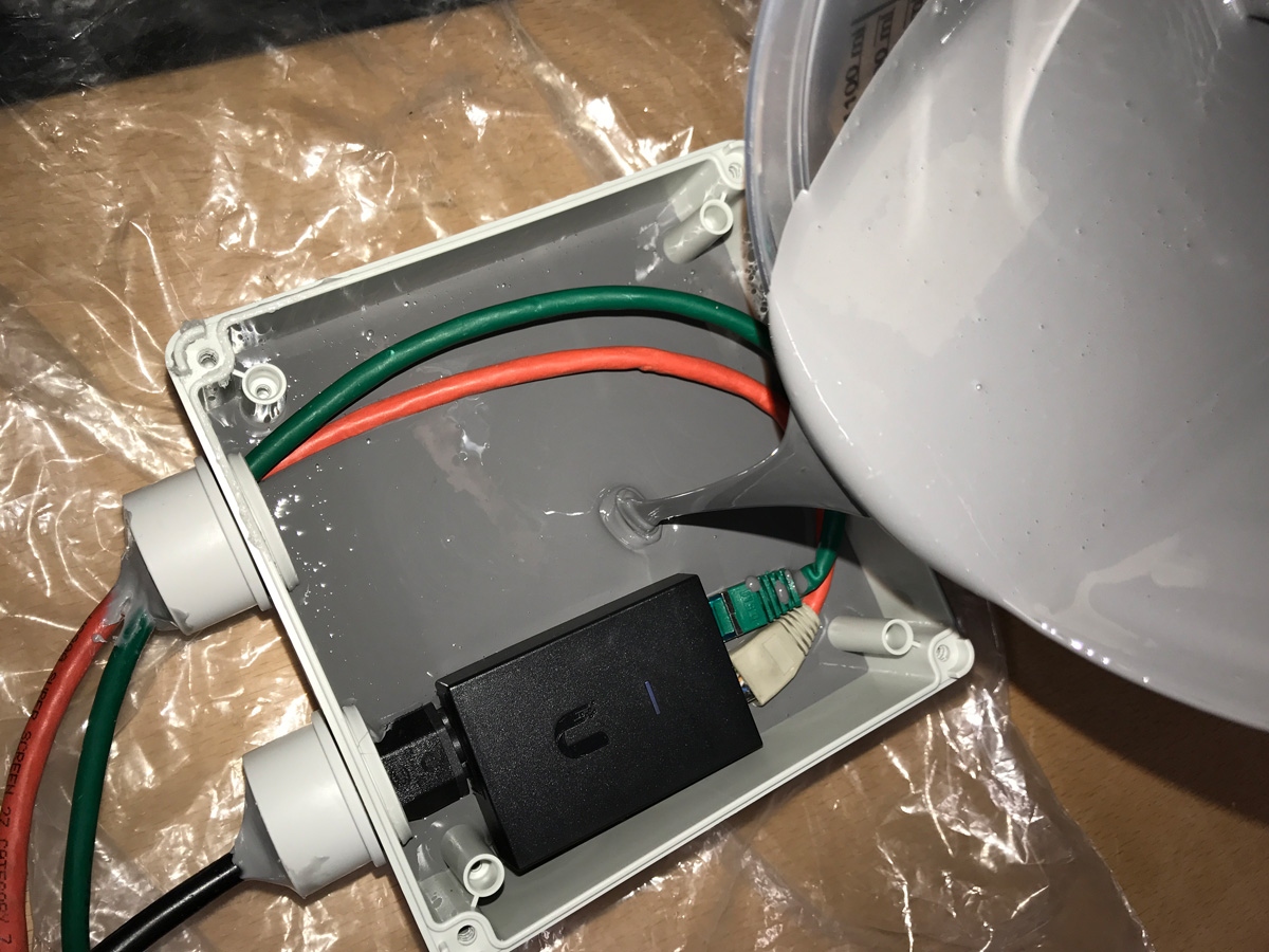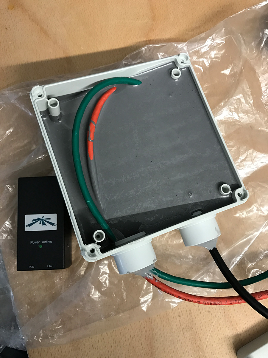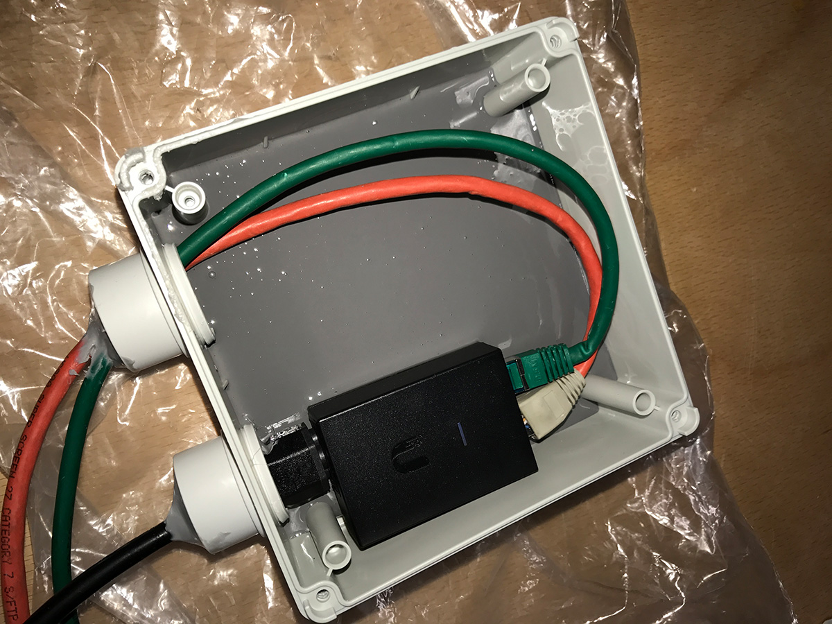 Auf der Suche nach einer Lösung für ein wasserfestes PoE Netzteil sind wir auf einen sehr interessanten Lösungsansatz gestoßen. Bereits seit drei Tagen testen wir unter Wasser ein herkömmliches Ubiquiti PoE Netzteil, welches komplett in Gießharz vergossen wurde.