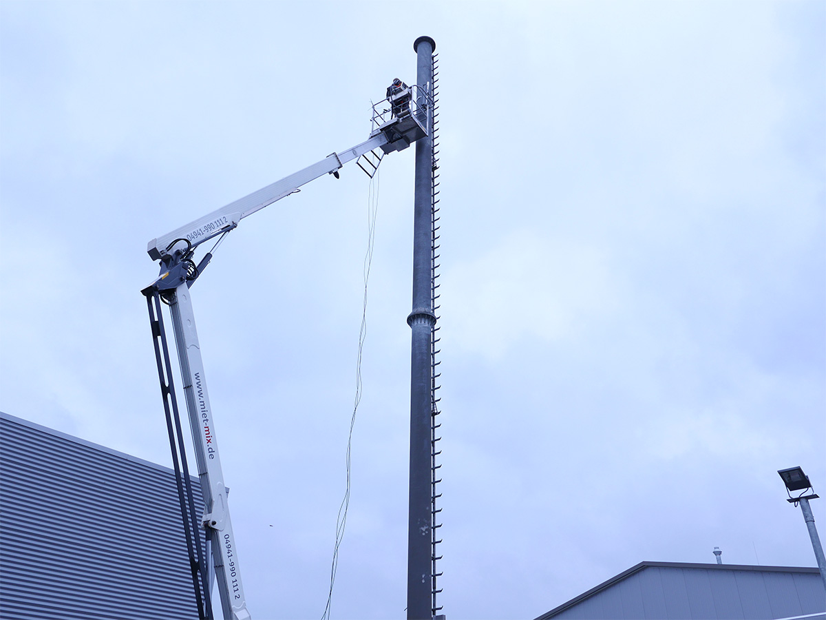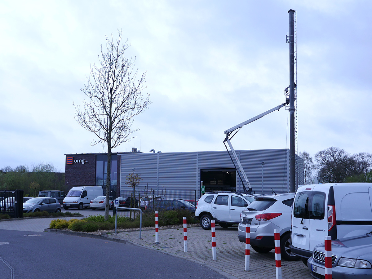 Nachdem der Funkmast auf dem OMG Firmengelände Anfang März aufgestellt wurde, erfolgte nun die erste Installation einer Funkkomponente.