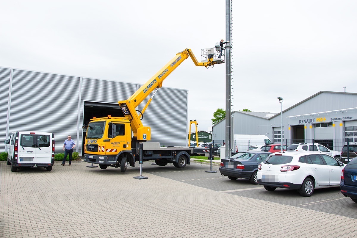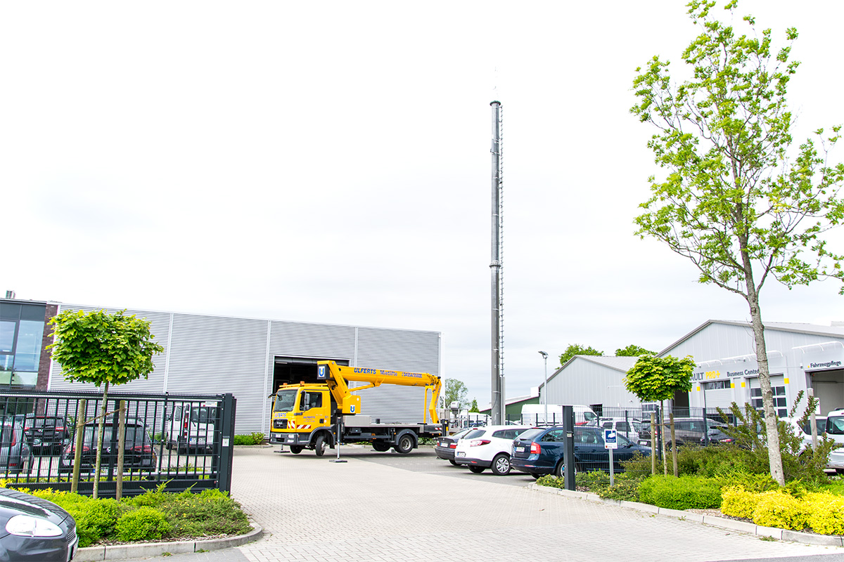 Anfang März wurde auf dem OMG Firmengelände ein Funkmast errichtet, um das eigene Funknetz bestmöglich zu optimieren und zu erweitern. Für die Versorgung des umliegenden Gewerbegebietes wurde auf ca. 17 Metern eine Ubiquiti Rocket M5 mit einer 120° airMAX 5GHz Sector-Antenne verbaut.